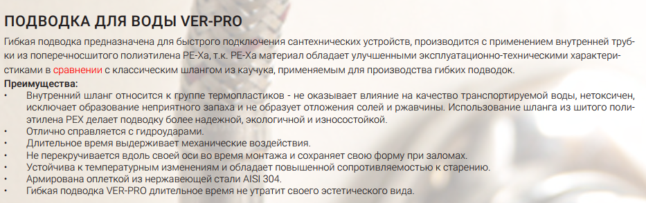 Преимущества использования гибкой подводки VER-PRO для воды с внутренним шлангом из РЕХ: