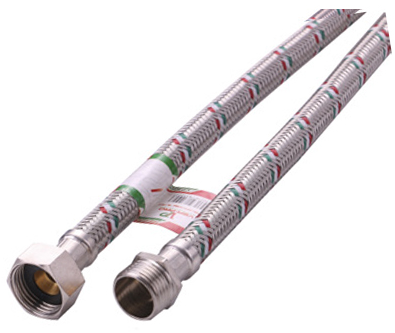 Подводка армирована оплеткой из усиленной нержавеющей стали AISI 304. Армирование шланга оплеткой из нержавеющей стали AISI 304 обеспечивает функционирование изделия, без протечек при давлении 15-20 атмосфер и температуре до 90º С, увеличивает прочность шланга на разрыв до 120 атмосфер. Благодаря свойствам нержавеющей стали гибкая подводка длительное время не утратит своего эстетического вида.