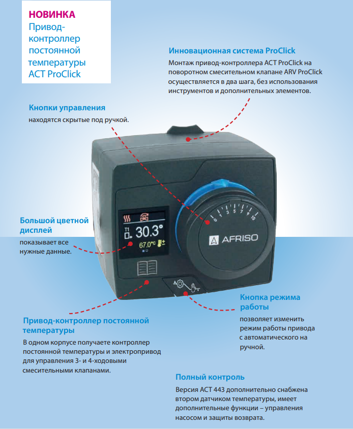 Привод–контроллер постоянной температуры ACT предназначен для 3-х и 4-х ходовых поворотных смесительных клапанов, для поддержания постоянной температуры теплоносителя. Привод ACT используется с клапанами ARV AFRISO любого размера. Контроллер работает автономно, по ПИД-алгоритму, дополнительная автоматика не требуется. Привод ACT оснащен сенсорными кнопками для установки необходимой температуры и навигации по меню. Широкий температурный диапазон (0 - 99°С) и возможность переключения режимов позволяет использовать ACT в системах отопления и охлаждения. Привод ACT имеет функцию отображения заданной или измеренной текущей температуры смешанного теплоносителя и оснащен выносным датчиком температуры и кабелем с вилкой для подключения электропитания.