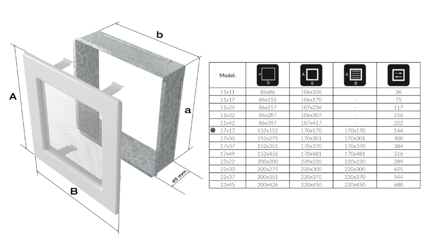 К тому же размер 17х17 отлично подходит для обычной домашней вентиляции. Остальные размеры также можно использовать для обычной вентиляции в тех или иных местах. Как опция предусмотрена вторая решётка, которая уменьшает сквозной просмотр.