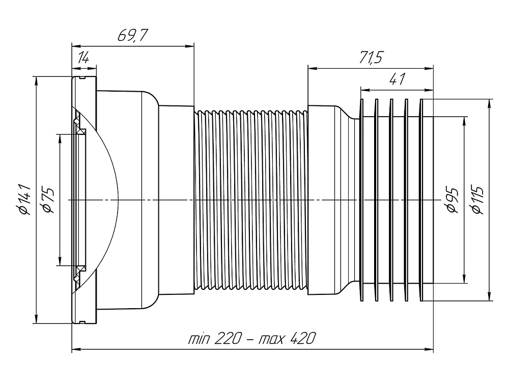 Удлинитель гибкий гофрированный для унитаза K918 с металлической спиралью выпуск 100-110 мм предназначен для присоединения унитазов к системе канализации. Диапазон длины: 220-420 мм.