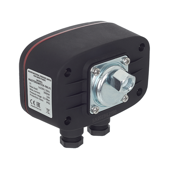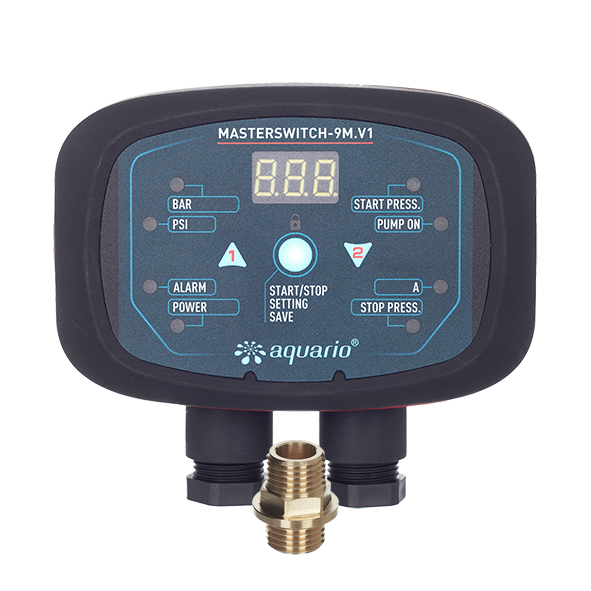 Основная функция реле Masterswitch-9M.V1- автоматическое включение-отключение водяного электронасоса в зависимости отзначения давления воды в месте установки реле. Когда давление воды достигает настроенного уровня Рстоп реле разрывает цепь, останавливая насос; когда давление снижается до уровня Рстарт, реле замыкает цепь. Уровни давления Рстоп и Рстарт настраиваются пользователем в соответствии стребованиями системы водоснабжения.