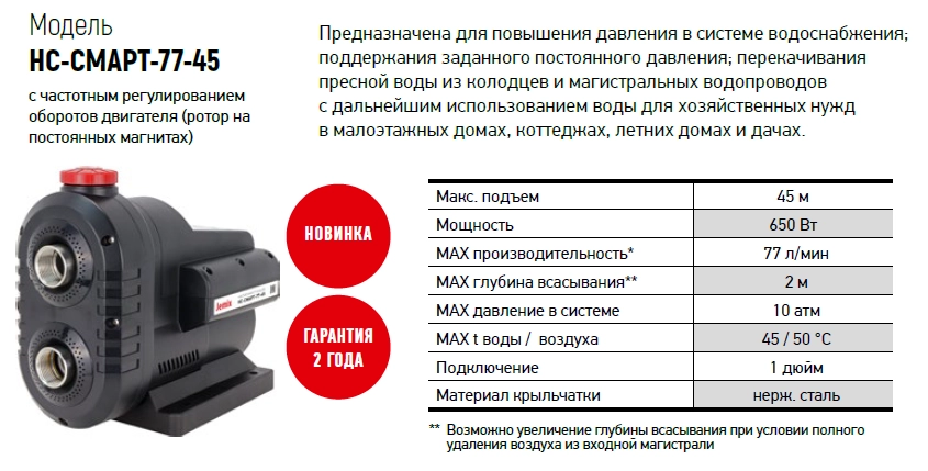 Назначение станции JEMIX НС-СМАРТ-77-45: повышение давления в системе водоснабжения; поддержание заданного постоянного давления в системе водоснабжения; перекачивания пресной воды из колодцев и магистральных водопроводов с дальнейшим использованием воды для хозяйственных нужд.