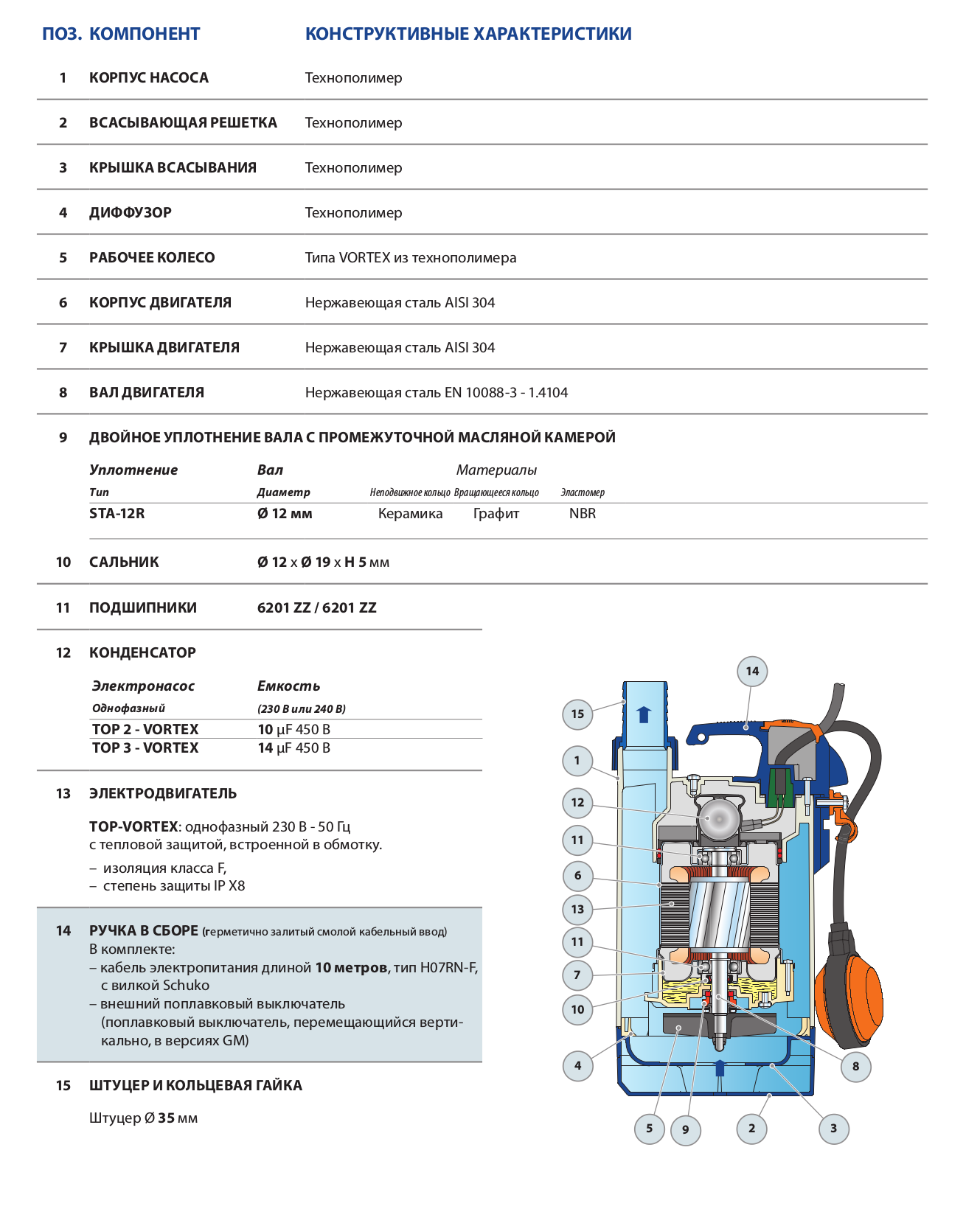 - Применённые конструктивные решения обеспечивают простоту в эксплуатации и безопасность функционирования насоса, благодаря полному охлаждению двигателя и двойному механическому уплотнению вала.