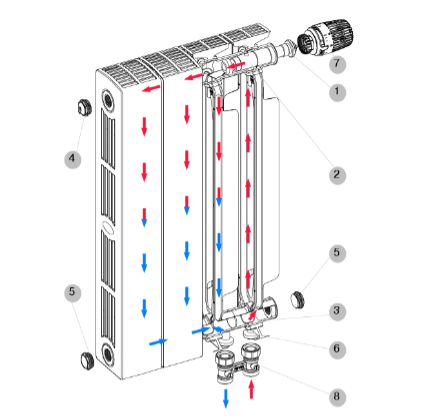 Схема движения теплоносителя в радиаторе RIFAR SUPReMO VENTIL приведена на рисунке.