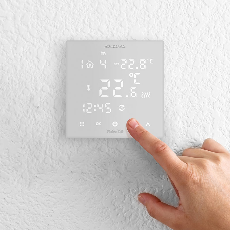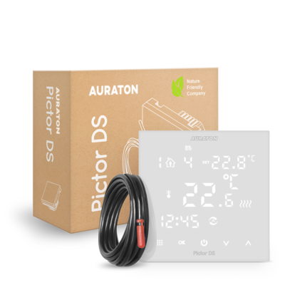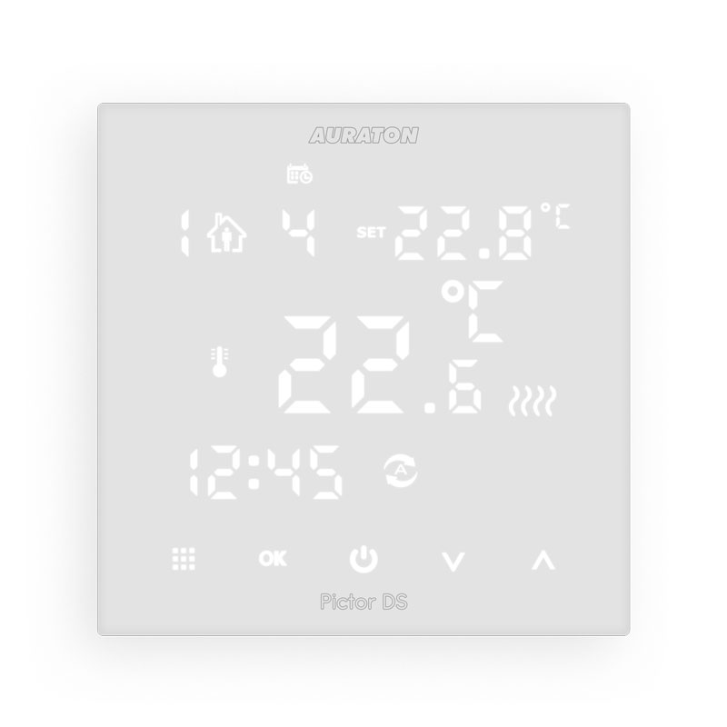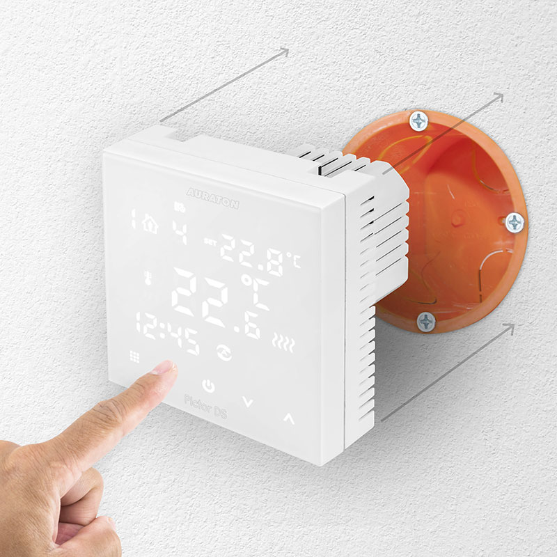 Встраиваемый в подрозетник AURATON Pictor DS – электронный регулятор температуры с сенсорной панелью, который позволяет точно устанавливать необходимую температуру в комнате или температуру пола. Работает с отопительным устройством, например, газовым, электрическим котлом, а также матами, пленками и нагревательными кабелями, а также электрическими нагревателями. Пользователь может управлять 6 температурными программами в течение суток, организованными в 3 еженедельных расписания. Кроме того, он имеет возможность устанавливать ручную температуру.