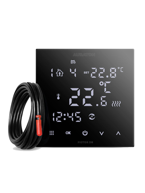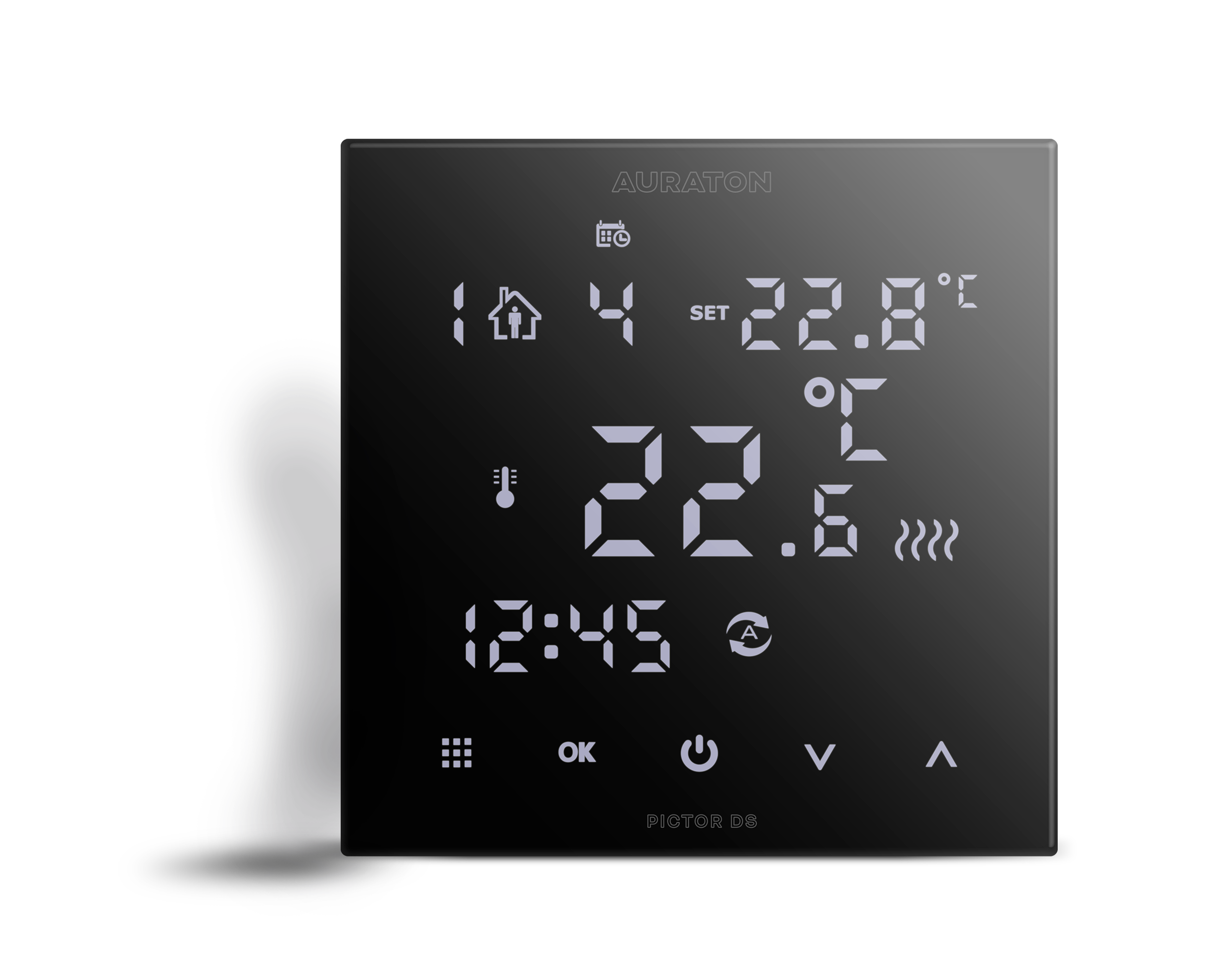 Встраиваемый в подрозетник AURATON Pictor DS – электронный регулятор температуры с сенсорной панелью, который позволяет точно устанавливать необходимую температуру в комнате или температуру пола. Работает с отопительным устройством, например, газовым, электрическим котлом, а также матами, пленками и нагревательными кабелями, а также электрическими нагревателями. Пользователь может управлять 6 температурными программами в течение суток, организованными в 3 еженедельных расписания. Кроме того, он имеет возможность устанавливать ручную температуру.