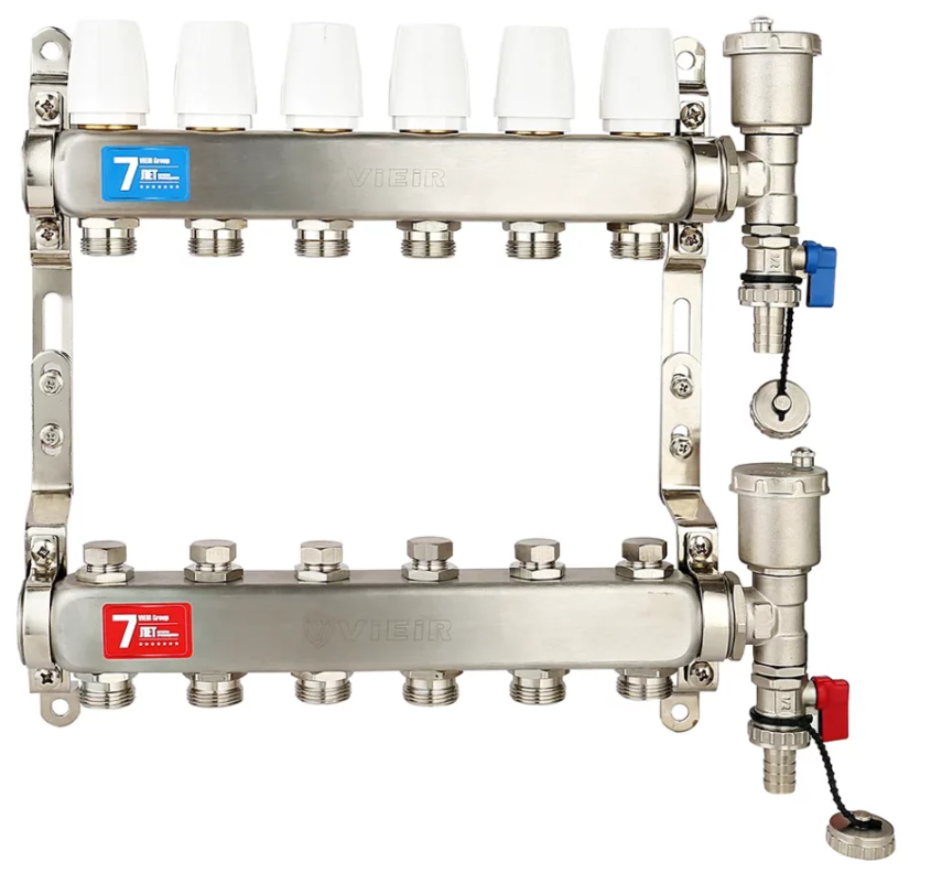 Коллектор из нержавеющей стали в сборе без расходомеров VIEIR от 2 до 12 выходов предназначен для распределения теплоносителя по системе радиаторного отопления в многоквартирных домах или зданиях индивидуальной постройки. Изделие способно направлять теплоноситель на несколько зон отопления.