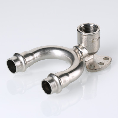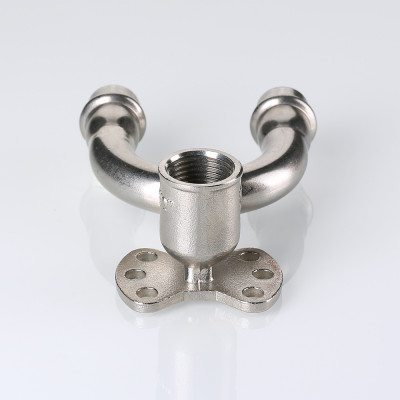 (VTi.954.DI) Проходная водорозетка в системе INOX-PRESS представляет собой U-образный тройник с угловым переходом на внутреннюю резьбу в центральном отводе и креплением.
