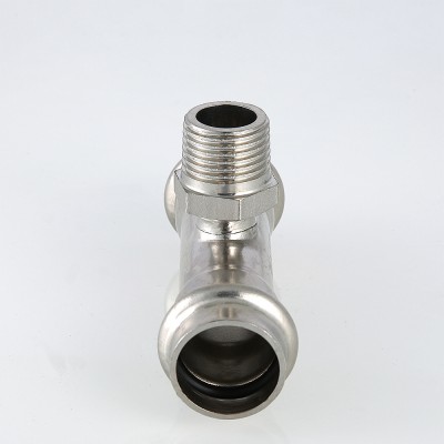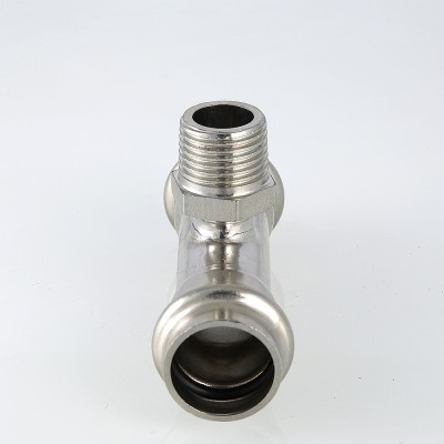 (VTi.933.I) Пресс-тройник из нержавеющей стали с наружной резьбой предназначен для соединения тонкостенных стальных труб с резьбовым элементом системы водоснабжения, отопления, других инженерных и технологических установок. Фитинг рассчитан на эксплуатацию при максимальной рабочей температуре 95 °С. Номинальное давление – 16 бар.