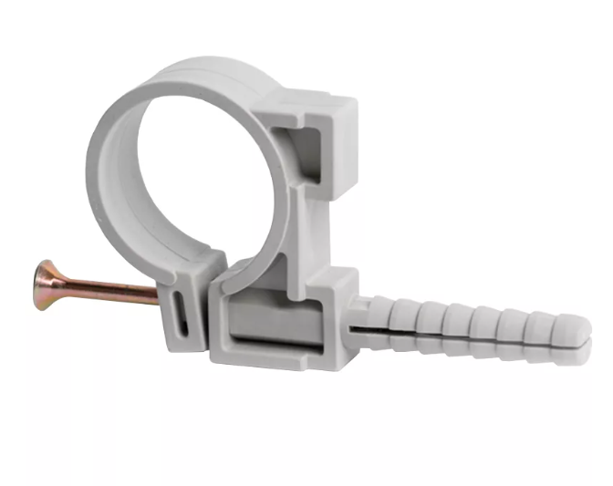 Дюбель-хомут – это крепёж для труб, проводов и кабелей. Представляет собой комбинированное изделие, которое состоит из пластикового кольца и дюбеля с шурупом.