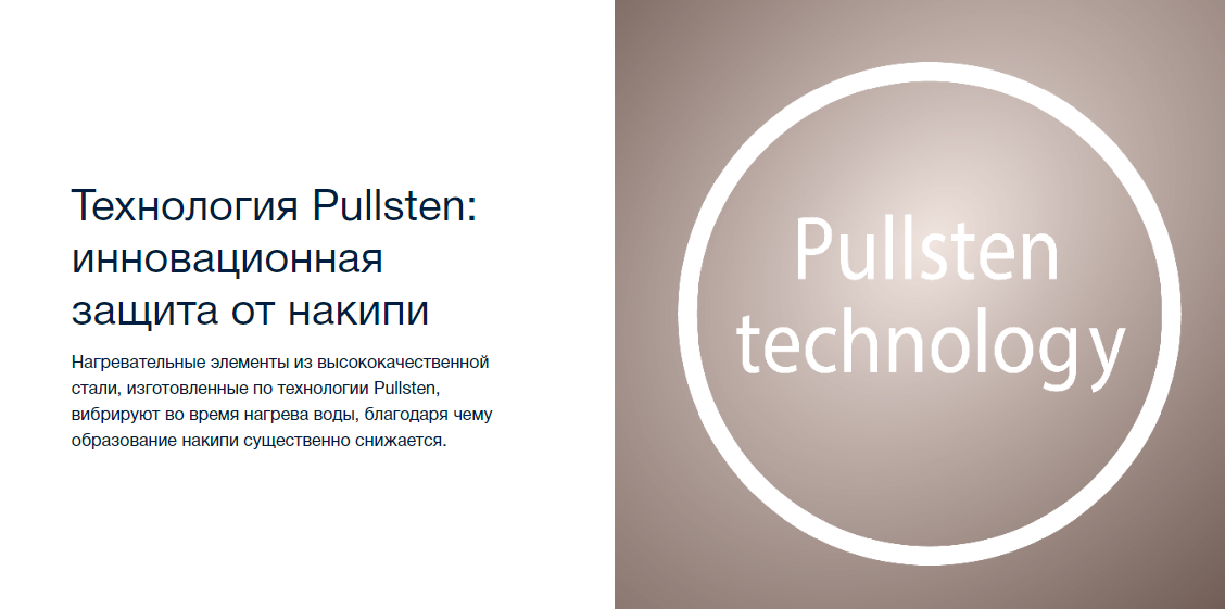 Нагревательные элементы из высококачественной стали, изготовленные по технологии Pullsten, вибрируют во время нагрева воды, благодаря чему образование накипи существенно снижается.