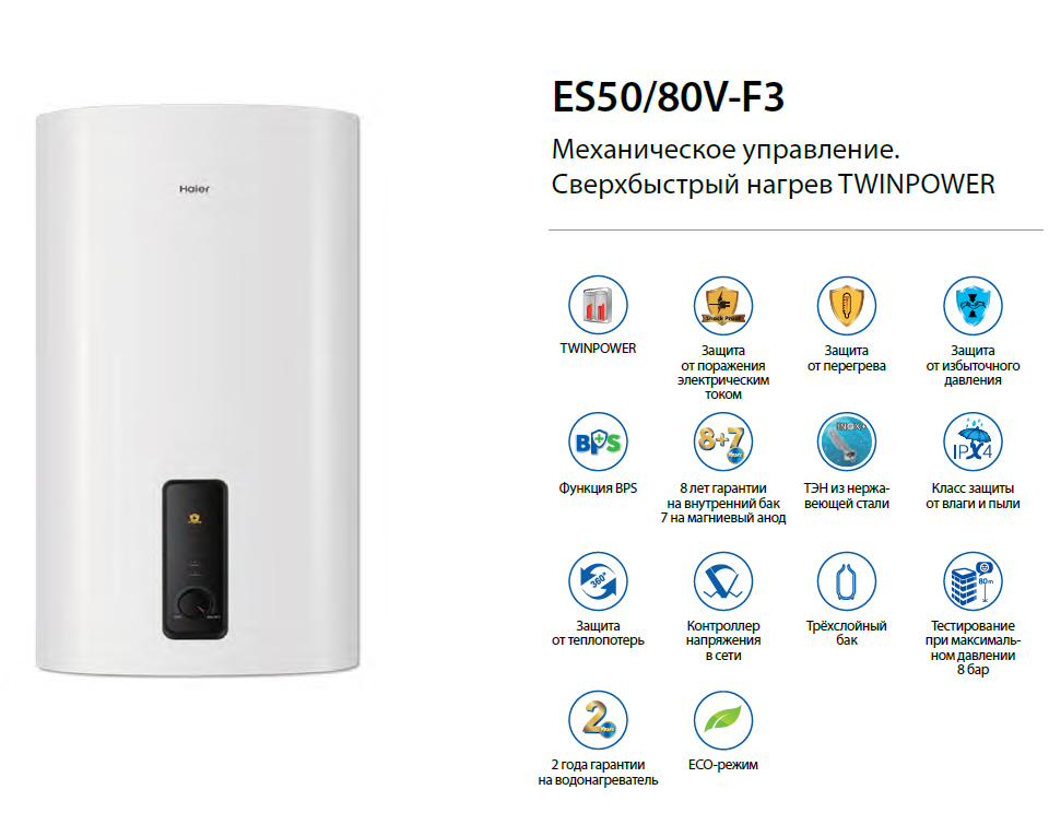 - TWINPOWER мощность 3 кВт = 1,5 + 1,5 кВт ТЭНы в каждом баке.